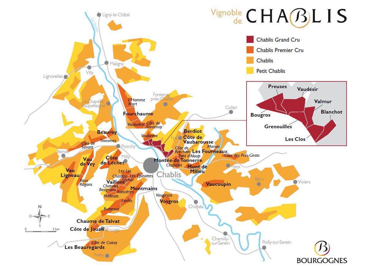 De Chablis is het noordelijkste wijngebied in de Bourgogne. Het is een gebied waar de Chardonnay-druif strakke, terroirgetypeerde wijnen voortbrengt. De unieke bodem in Chablis bestaat uit fossielrijke kalk, genaamd ‘kimmeridge’. De fossielresten dateren uit een antediluviaal verleden. De beste locaties zijn toebedeeld aan 7 Grand Cru wijngaarden: Bougros, Les Preuses, Vaudésir, Grenouilles, Valmur, Les Clos and Blanchot. De productie hiervan bedraagt slechts ongeveer 3%. De Premier Crus zijn iets sneller op dronk, bij voorkeur 3-5 jaar na de oogst. De appellations Chablis en Petit Chablis vormen het grootste deel van de productie. Door de grote vraag naar Chablis zijn de grenzen al diverse malen uitgebreid, dit tot groot ongenoegen van sommige producenten. Ook blijft hier de eeuwige discussie of een echte Chablis al dan niet op hout dient te rijpen. De drie onbetwiste topproducenten zijn hier Raveneau, Dauvissat en sinds enkele jaren ook het huis William Fèvre. De laatste jaren lijken ook enkele jongere producenten de weg omhoog gevonden te hebben onder hen Denis en Isabelle Pommier.