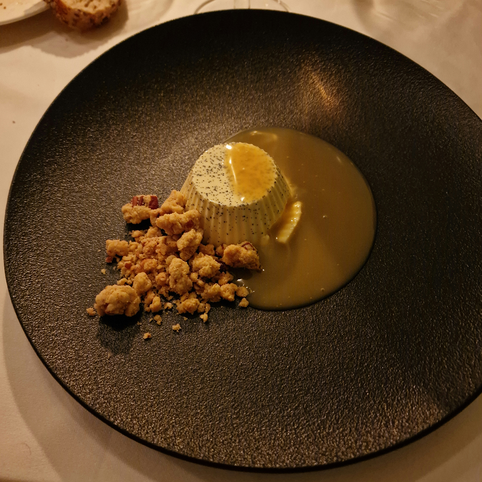 8. Pannacotta met rozemarijn, pecacrumble en caramelsaus.